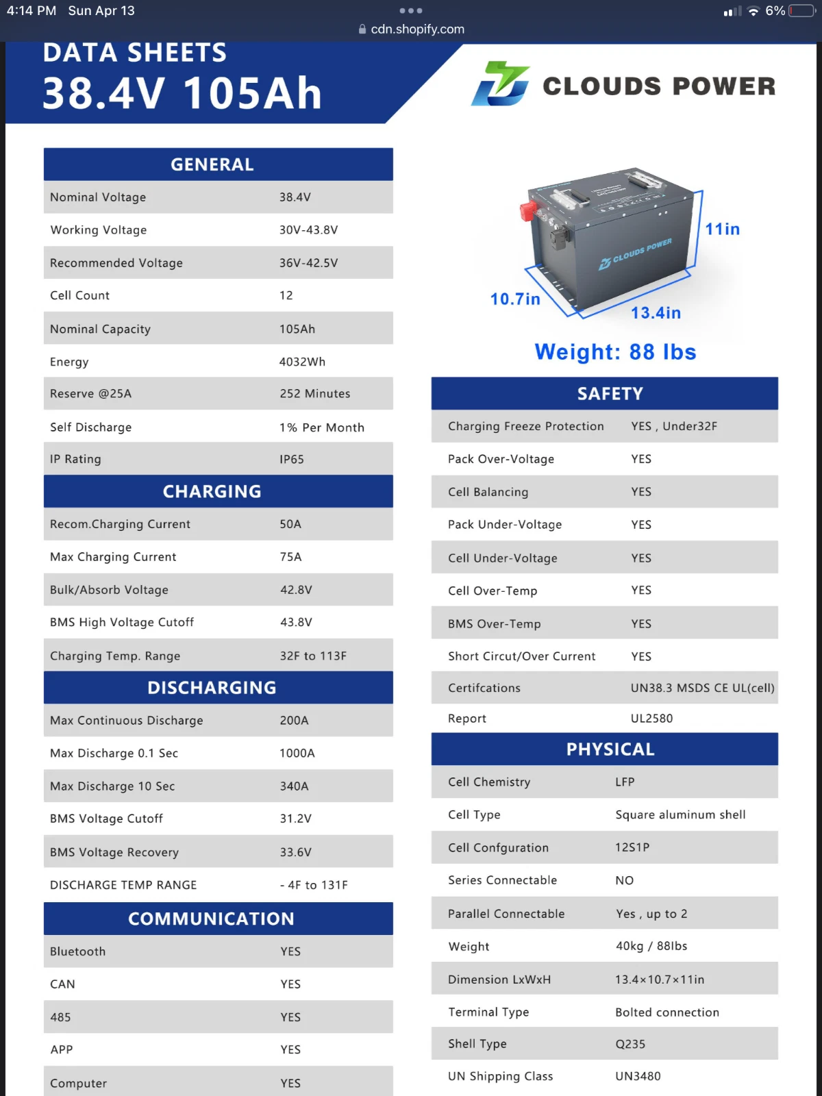 A fully charged 36V 105AH Clouds Power battery can travel up to 40 miles on a charge, and weighs only 88 pounds, as opposed to the approximately 300-400 pounds of extra weight a system of lead-acid batteries can add to a cart. This lithium iron phosphate battery also has an excellent BMS (Battery Management System) function, which can prevent its overvoltage or undervoltage, overcurrent, high temperature, or short circuit.